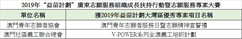 參選全國大賽初審的項目除澳門區選拔賽8個獲獎項目外,將聯同榮獲2019年“益苗計劃”廣東志願服務組織成長扶持行動暨志願服務專案大賽推薦的獲獎項目:“澳門青年志願者服務日暨志願精神宣誓禮”及“V-POWER系列全澳義工培訓計劃”2個本澳項目,合共10個項目共同進入全國大賽初審。